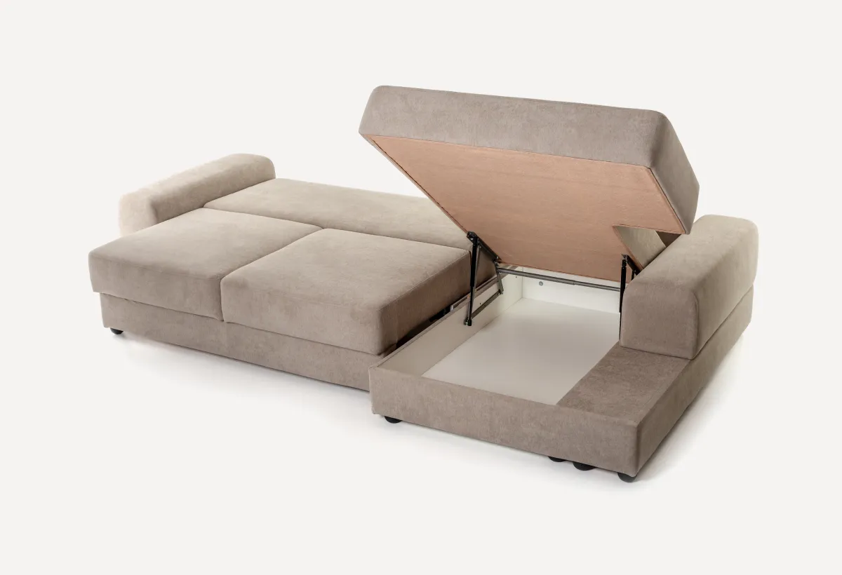 Диван Андрэа — это модульная система, которую вы собираете под себя. Хотите компактный прямой диван? Пожалуйста. Нужна большая угловая конструкция с местом для хранения? Тоже без проблем. Внешне — строгий минимализм. Никаких завитушек и лишнего декора, только прямые линии и простая геометрия. Благодаря этому он одинаково хорошо смотрится в современной гостиной, квартире-студии или даже спальне. Добавьте сюда детали из скандинавского стиля и лофта — получится мебель, которая не будет спорить с интерьером, а станет его аккуратной частью. Внутри — добротный каркас из ДСП и фанеры, пружинный блок «змейка» и многослойный поролон (жесткий, плотный, сверху — лотекс и холкон). То есть диван рассчитан на ежедневную нагрузку. Производитель заявляет до 110 кг на одно посадочное место и 140 кг на спальное. В общем, сделано на совесть. Соединяются модули между собой обычными болтами — ничего не будет разъезжаться.