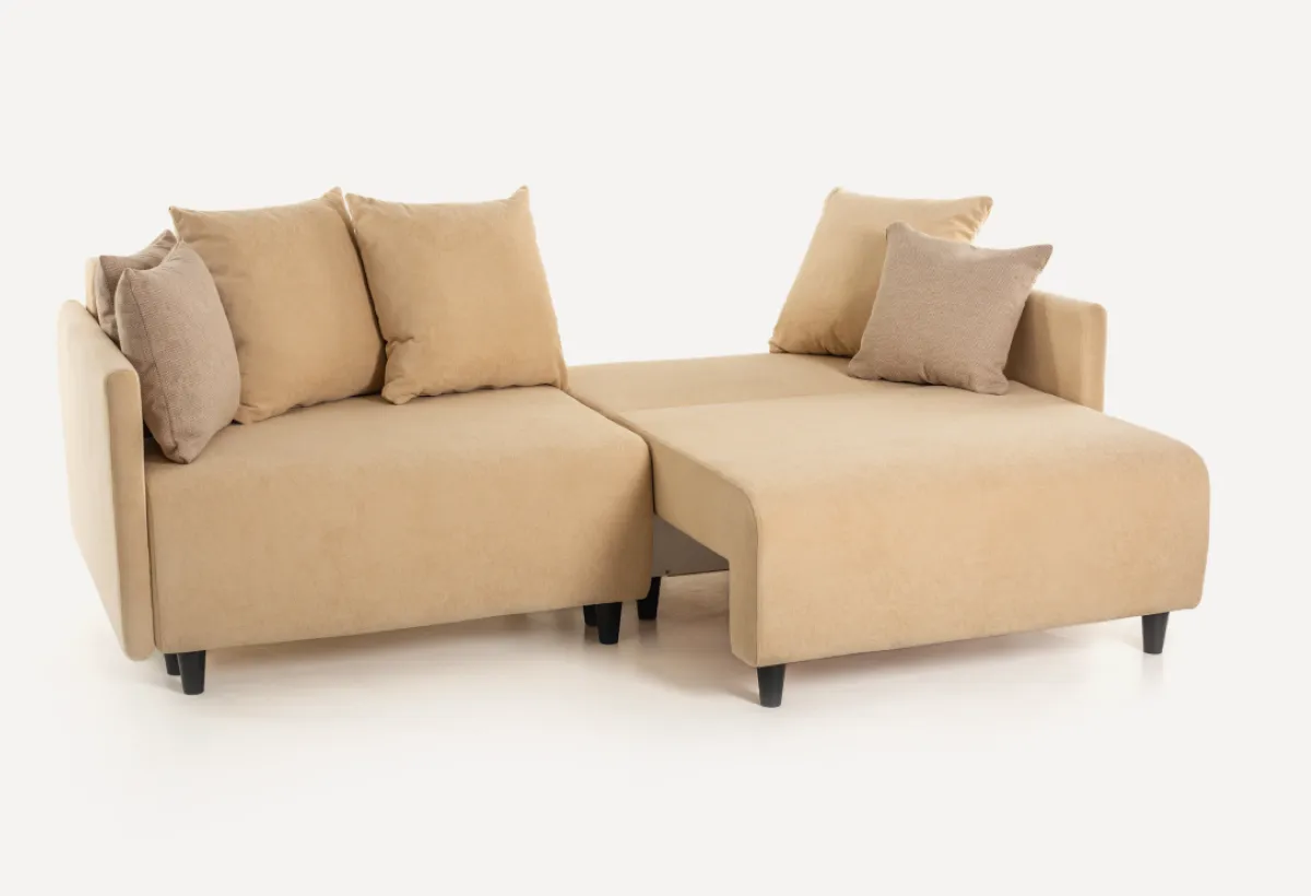 Одна из главных фишек этого дивана — его универсальность. Он состоит из двух модулей, каждый из которых оснащён механизмом трансформации. Это значит, что вы можете использовать их вместе или по отдельности, выдвигая один из модулей и превращая его в оттоманку. Такой формат позволяет легко адаптировать диван под размеры комнаты или ваши текущие нужды. А чёрный пластик на ножках не только выглядит стильно, но и выдерживает высокие нагрузки. В общем, это не просто диван — это мебель, которая растёт вместе с вами.