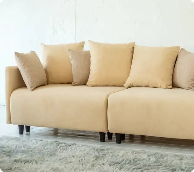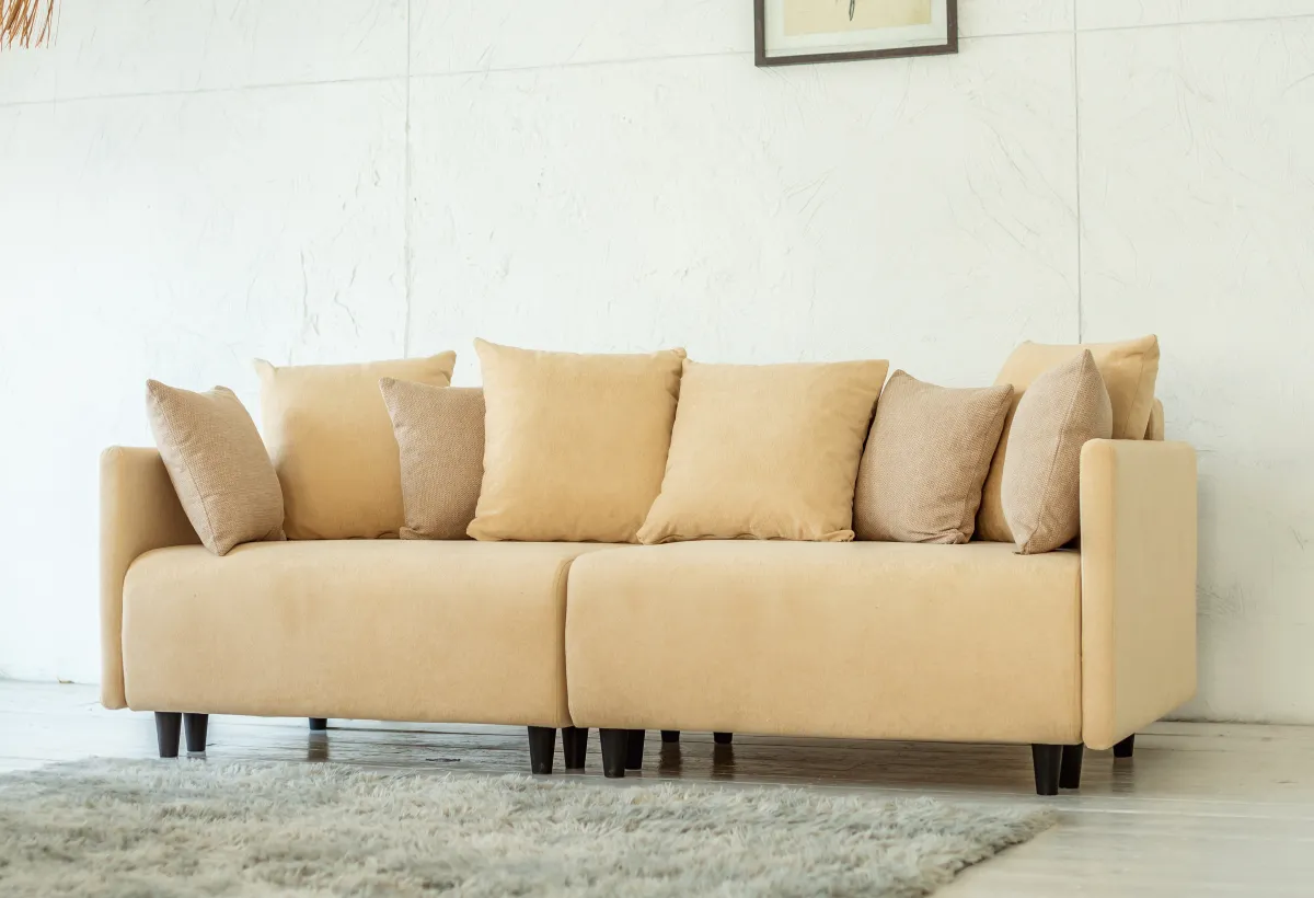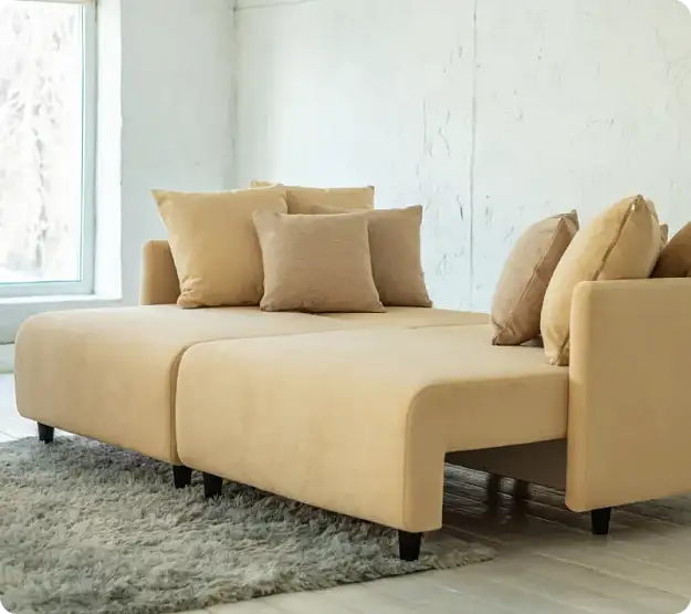 Диван выполнен из прочных материалов: каркас из сосновых брусков и ортопедическая пружинная основа гарантируют долговечность и комфорт. Обивка из прочного и приятного на ощупь материала не потеряет форму даже через годы использования. Подушки, наполненные гипоаллергенным материалом, не сминаются и не теряют форму. А ещё их можно вынуть из чехлов и постирать — это важно, когда в доме есть дети или животные. Все детали продуманы: от надёжного механизма трансформации до лаконичного дизайна без лишних деталей.